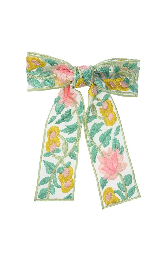 Add a whimsical touch to your hairstyle with the L. Erickson Sonoma Bow Barrette. Featuring a colorful, embroidered floral print, this ribbon bow exudes charm and elegance, perfect for any occasion. Its French-style barrette clasp ensures a secure and comfortable hold, making it ideal for most hair types. The bow measures 7 1/4 inches long, creating a beautifully layered effect. Whether you're styling an elegant updo or pinning back loose strands, this versatile accessory is as functional as it is fashionable. Elevate your look effortlessly with this stunning hair bow, perfect for special occasions or everyday wear.
