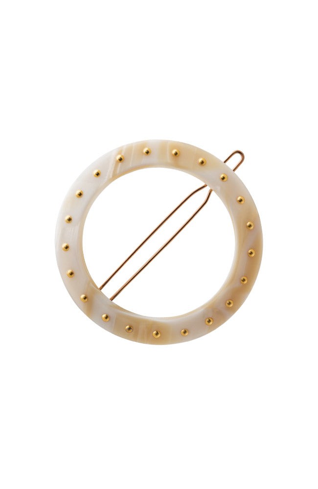 France Luxe Studded Circle Cutout Tige Boule Barrette is a chic accent piece. Handcrafted in France and polished to perfection, the barrette features a small plastic tige boule clasp, making it an excellent choice for styling fine hair. With its modern cutout design and brass studs, this eye-catching hair clip will elevate any ensemble.