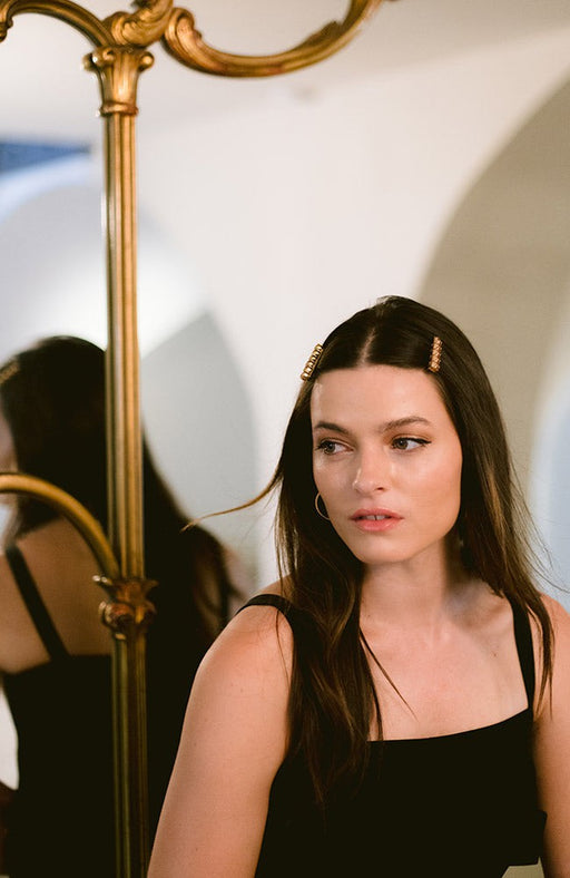 The Joy Tige Boule Barrette by L. Erickson is an elegant gold and crystal hair clip, designed to add a touch of sophistication to your hairstyle. F...