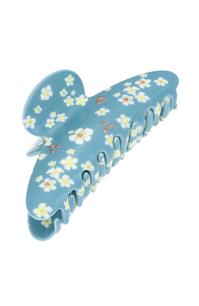 The Kiki Jaw Hair Clip by L. Erickson is a delightful and practical accessory that adds a touch of floral charm to any hairstyle. This blue and white flower hair clip features a fun, floral print, making it a stylish choice for women. Designed with a strong spring clasp, it provides a secure and comfortable hold, making it ideal for most hair types. Its dimensions of 1 3/4 inches wide and 4 inches long make it perfect for creating a variety of hairstyles with ease. Add a vibrant and playful touch to your look with this charming hair clip by L. Erickson.