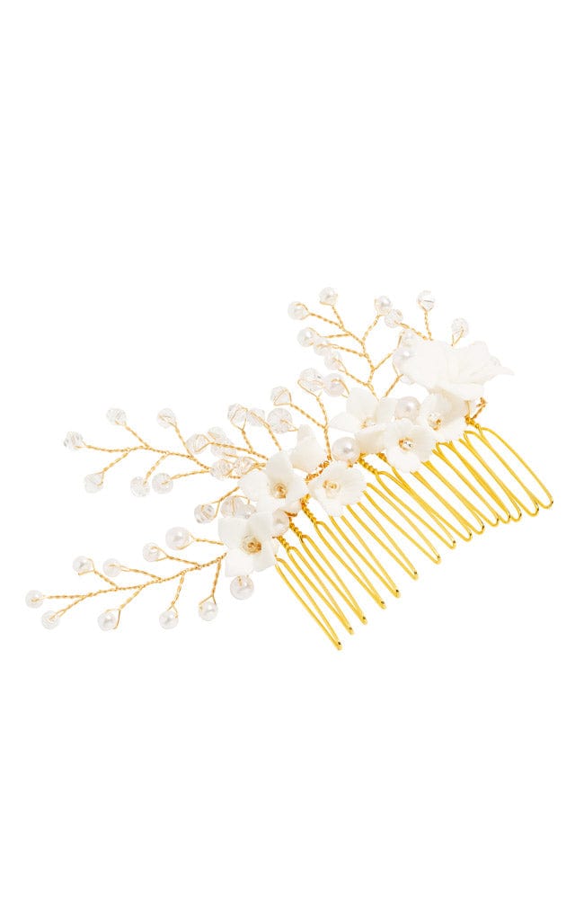 This Briar Embellished Comb by L. Erickson features stunning faux pearls and white floral accents. The beautiful gold wire branches with cream pearl tips will stylize your hair do, making for a gorgeous walk down the aisle. Ensure this day to remember has style to match.