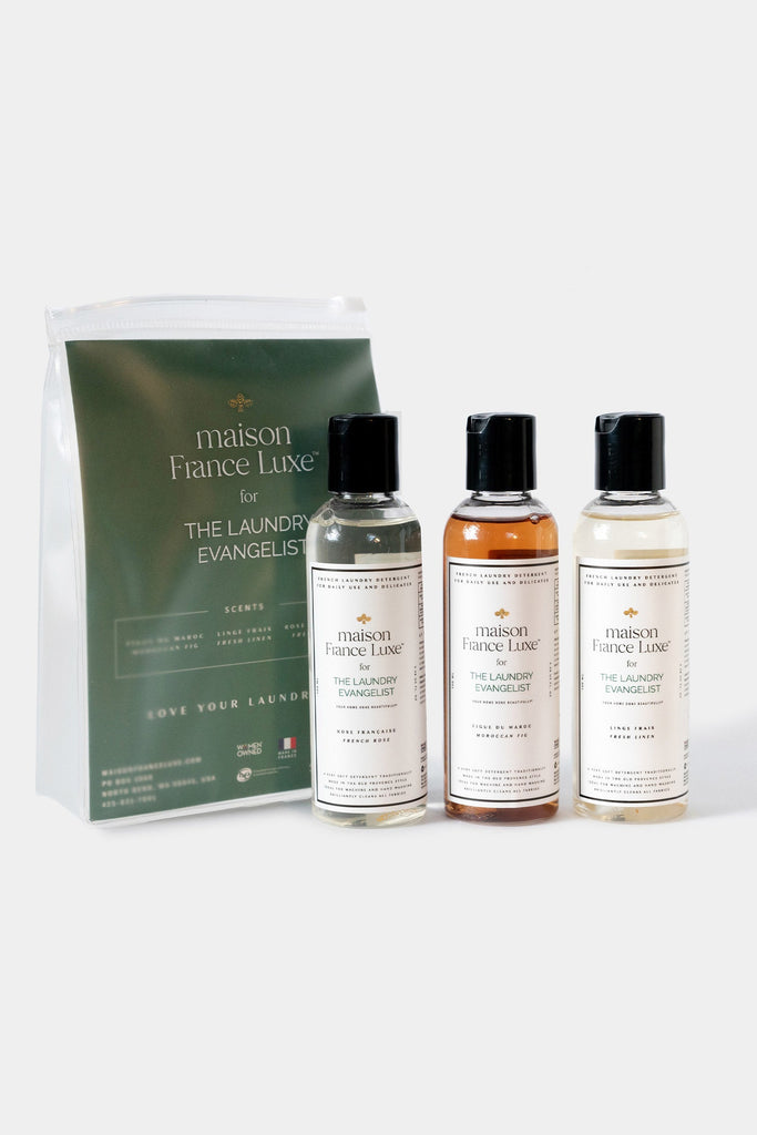 As a collaboration between Maison France Luxe and The Laundry Evangelist, this Luxe Laundry Trio offers three of our signature, haute‑fragrance laundry detergents in one beautifully packaged set. Each scent is carefully chosen to delight your senses and care for your fabrics: