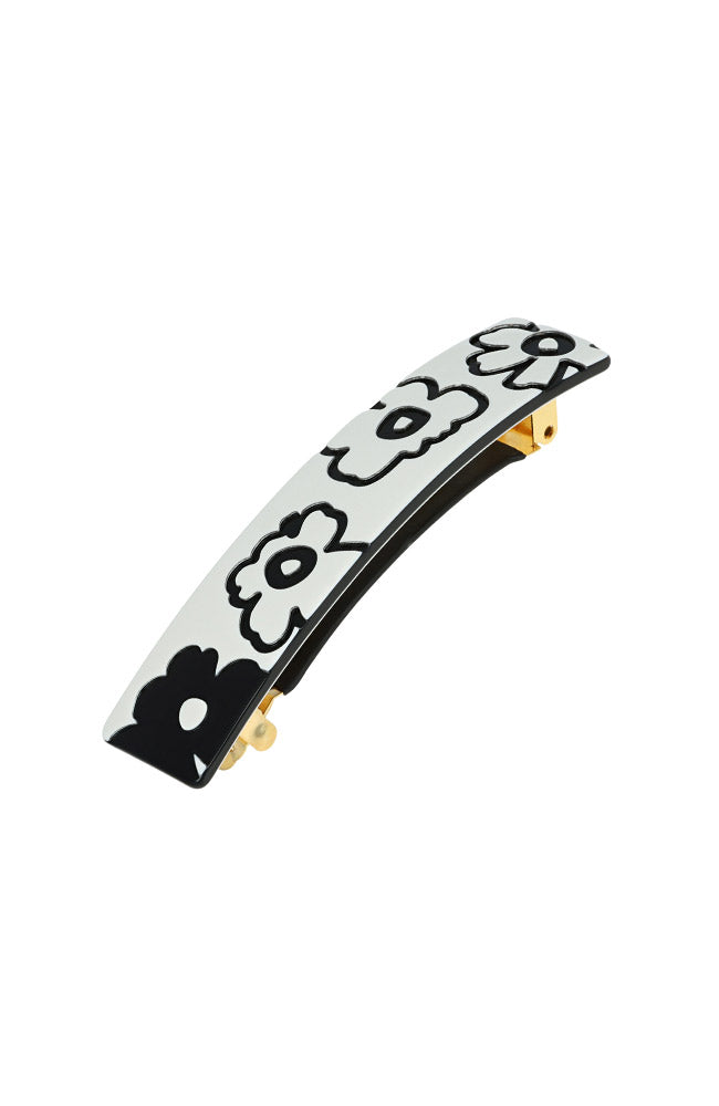Refined and feminine, the France Luxe Fiorella Floral Barrette is your go-to accessory for an effortlessly elegant hairstyle. Featuring a sophisticated black and white floral design, this French-made barrette is expertly crafted from cellulose acetate for a lightweight yet durable finish. The strong French-style barrette clasp ensures all-day comfort and a secure hold, accommodating most hair types with ease. Measuring 3 inches long, it’s the perfect size for a sleek half-up style or to secure a ponytail. Add a touch of timeless beauty to your hair routine with this graceful piece.