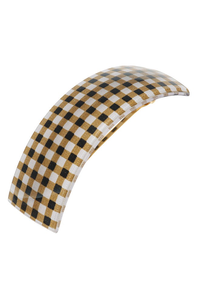 The France Luxe Rectangle Volume Barrette crafted for thicker hair, is an elegant acetate and metal hair clip made in France. Measuring 1 1/4 inches in width and 3 3/4 inches in length, this barrette showcases the charming Whiskey Check pattern, boasting a rich brown plaid print. Its sophisticated design merges functionality with style, providing a secure hold while adding a touch of refined flair to your hairstyle. Tailored for thicker hair textures, this barrette embodies both sophistication and practicality, making it an ideal choice to effortlessly enhance your daily and special occasion looks with its trending brown plaid pattern and expert craftsmanship.
