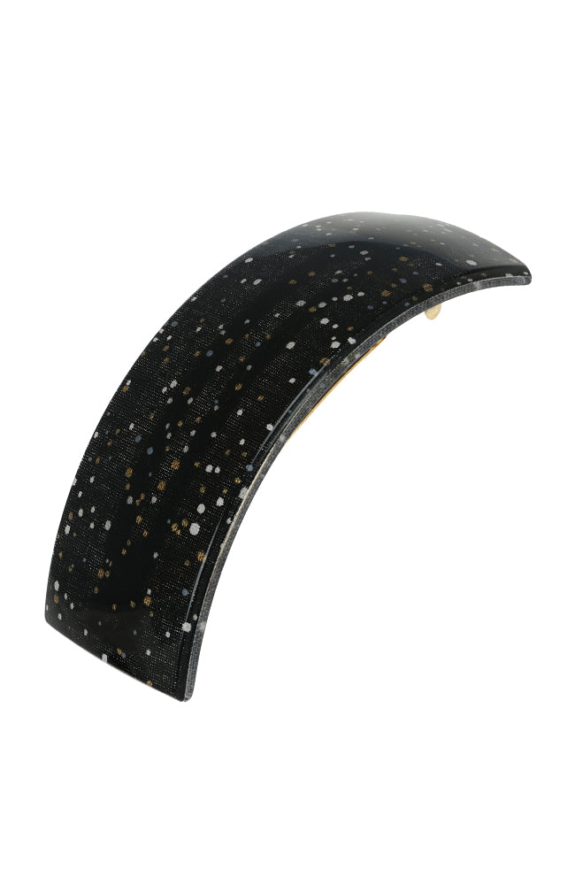 The France Luxe Rectangle Volume Barrette - Galaxy Print is a French-crafted hair clip for thick hair made from cellulose acetate. This stylish barrette is 3 3/4" long and 1 1/4" wide, featuring a sophisticated rectangular shape featuring Galaxy print. Recognized for its chic design and functionality, this barrette effortlessly adds volume to hair while securing it in place. The celestial-inspired print offers a touch of cosmic charm, making it a versatile accessory suitable for various hair types and styles, ideal for achieving a sophisticated and fashionable look.