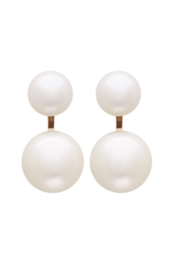 L. Erickson Double Majorca Pearl Two-Way Earrings are a chic accent piece. Made of plated brass and decorated with Majorca simulated pearls, the convertible earrings feature a removable charm back and can be worn as drops or studs. With their modern design and graceful style, these versatile earrings are an eye-catching addition to your ensemble.