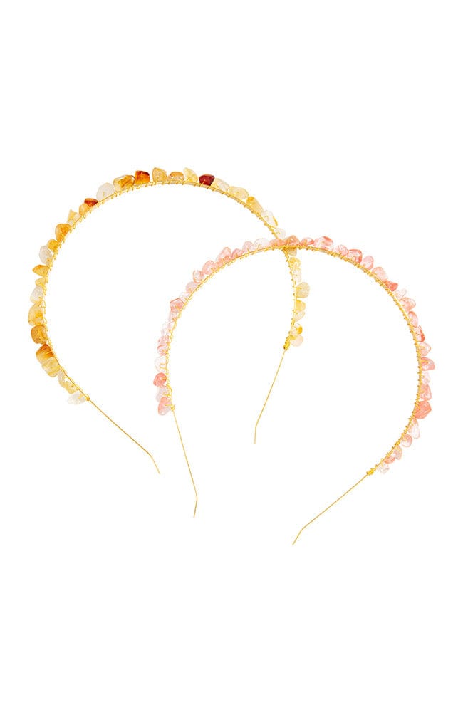 The L. Erickson Isla Headband 2-Pack is fun and festive pair of metal headbands. These gold tone metal bands each feature a beaded accent across the crown. One band features pink stones, the other with yellow and amber tones. These hair accessories work well for most hair types. Wear them together or one at a time and your outfit will be topped off with a warm, summer feel perfect for an easy breezy vibe.