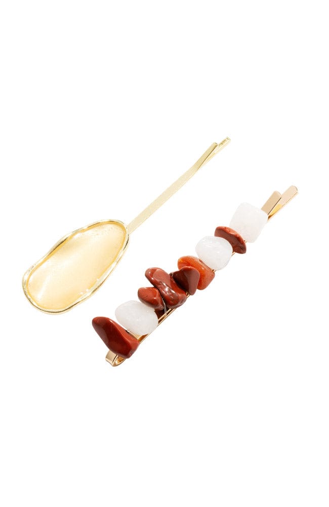 The L. Erickson Kia Bobby Pin Set is beautiful, boho style set of hair pins. Each gold tone bobby pin features a uniquely designed stone accent, one with multi colored orange and white stones, the other hair pin features a clear crystal afixed with a gold wire. These hair accessoies offer an easy hair style, strong hold, and a natural, summery vibes to your outfit.