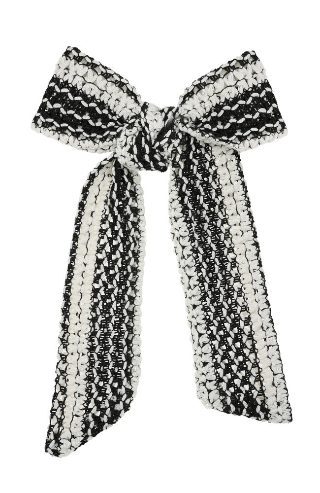 The L. Erickson Liz Bow Barrette, a chic black and white hair clip perfect for adding a touch of elegance to any hairstyle. This stylish barrette features a knit fabric bow, making it a standout accessory for most hair types. The 6" long barrette, adorned with a 7" long bow, provides a sophisticated and fashionable look that's ideal for both everyday wear and special occasions. The strong French style barrette clasp ensures a comfortable and secure hold, offering an easy and reliable hair styling solution.