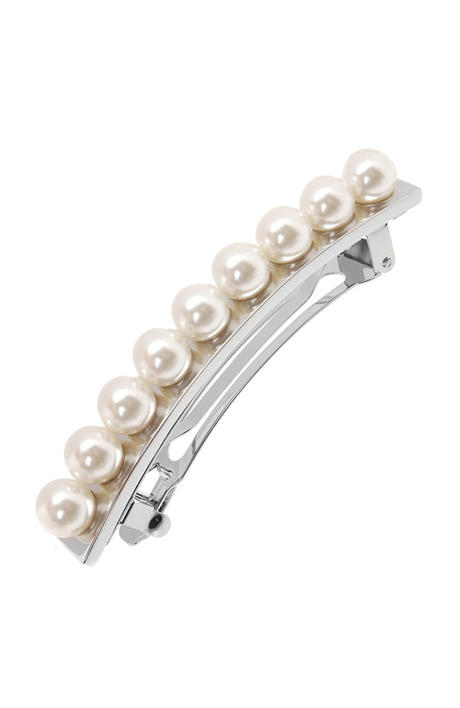 L. Erickson Pearl and Metal Barrette is a beautiful pearl hair clip. Made of polished metal adorned with glistening pearls, the barrette is perfect for special occasions. With its versatile size and elegant design, this decadent barrette is a stunning addition to your style.