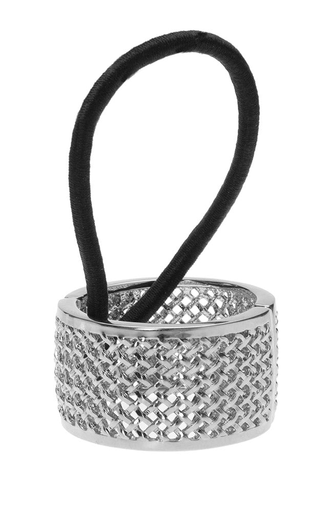 L. Erickson Woven Wire Cuff Pony is a striking accent piece. Made of tightly woven wire with a polished metal frame, the textured ponytail holder features a hinged cuff that opens to wrap around the base of your hair. With its unique design and chic metallic sheen, this cuff pony is an eye-catching addition to your ensemble.