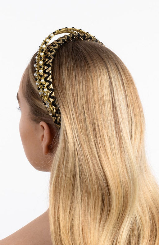 The L. Erickson Park Ave. Headband features faux pearls and crystals in various sizes and shapes. With a black velvet base and shimmering embellish...