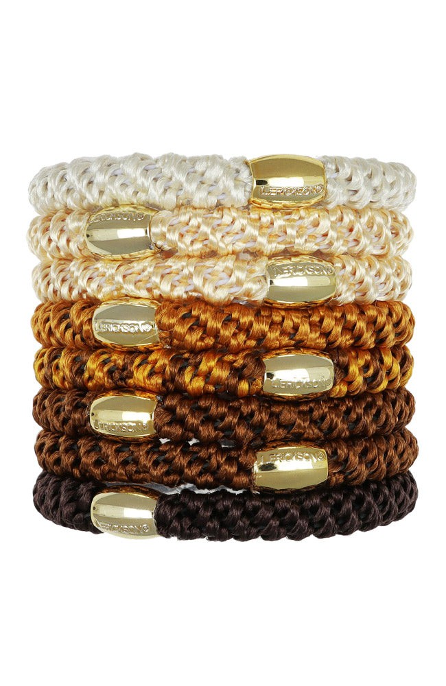 The L. Erickson Grab & Go Ponytail Holders are a polished upgrade to the classic ponytail. This 8-pack of hair ties for thick hair is crafted with a soft woven outer wrap and a durable elastic core, offering strong, all-day hold without tugging, creasing, or breakage. Each tie is finished with a metallic accent bead—an elegant detail that turns a functional essential into a stylish accessory for both hair and wrist.