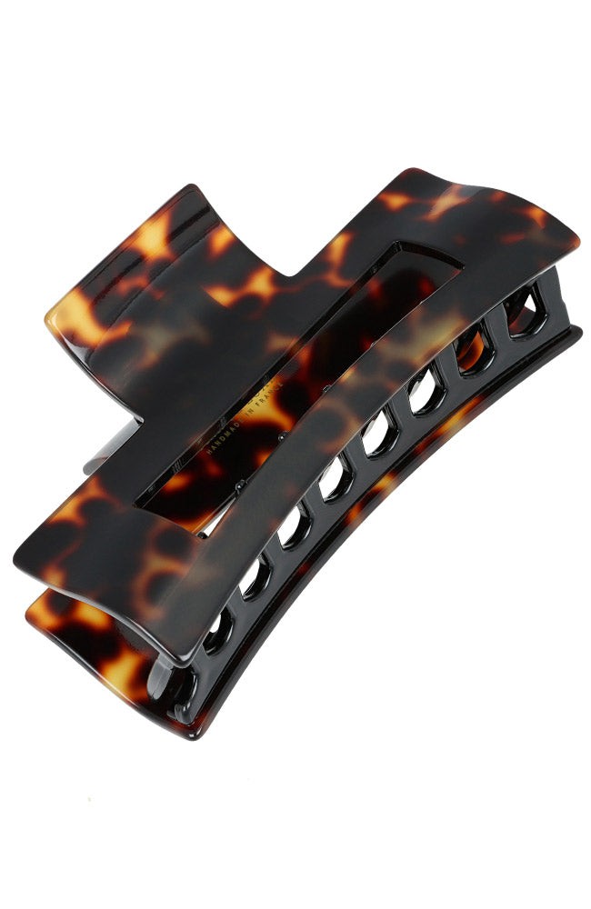 The Large Cutot Regcangle Jaw is universally loved and a customer favorite. Handmade in France from durable acetate and polished to a lustrous sheen, this clip ensures a secure hold with its strong spring claw clasp and smooth teeth. Measuring 2" wide and 4" long, the Large Cutout Rectangle Jaw is ideal for thick hair, providing a comfortable and elegant solution for your hair styling needs.